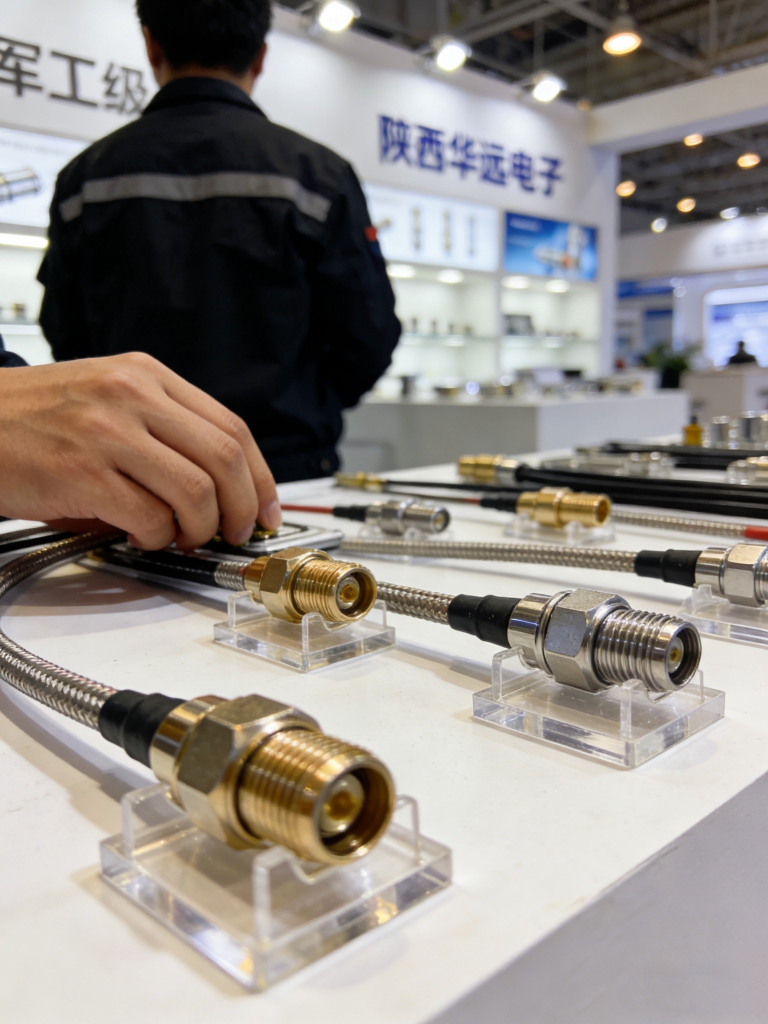 Подпись к изображению (изображения могут быть получены напрямую/сфотографированы): Выставочный стенд ООО Шэньси Хуаюань Электроникс (демонстрация коаксиальных разъемов RF и образцов кабельных сборок военного класса; сотрудники ведут переговоры с клиентами из аэрокосмической и телекоммуникационной отраслей)